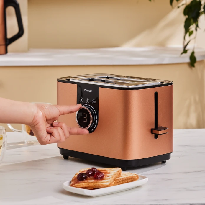 تسترنان 2 اسلایسر که می توانید 2 برش کوچک نان را همزمان برشته کنید. با طراحی فوق العاده زیبا و بدنه استیل ضد زنگ فضایی شیک به آشپزخانه شما می بخشد. به لطف ویژگی مرکز خودکار نان، تمام قسمت های نان شما را به طور یکنواخت برشته می کند. با عملکردهای یخ زدایی، گرم کردن و سوخاری کردن، امکان استفاده چند منظوره در یک محصول را دارید. با 7 سطح سرعت مختلف سرخ کردنی می توانید در اندازه دلخواه سوخاری کنید. یک محفظه برای جمع کردن خرده نان زیر دستگاه تعبیه شده که بصورت کشویی باز میشود برای تمیز کردن .