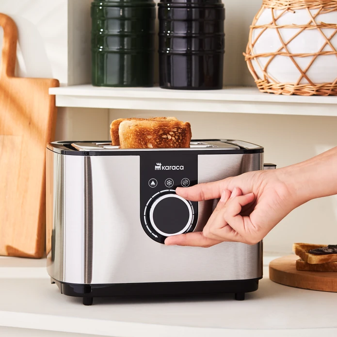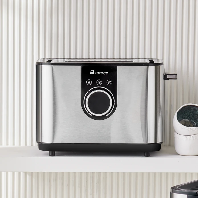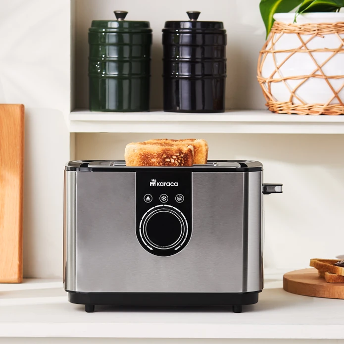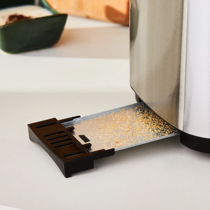 تسترنان 2 اسلایسر که می توانید 2 برش کوچک نان را همزمان برشته کنید. با طراحی فوق العاده زیبا و بدنه استیل ضد زنگ فضایی شیک به آشپزخانه شما می بخشد. به لطف ویژگی مرکز خودکار نان، تمام قسمت های نان شما را به طور یکنواخت برشته می کند. با عملکردهای یخ زدایی، گرم کردن و سوخاری کردن، امکان استفاده چند منظوره در یک محصول را دارید. با 7 سطح سرعت مختلف سرخ کردنی می توانید در اندازه دلخواه سوخاری کنید. یک محفظه برای جمع کردن خرده نان زیر دستگاه تعبیه شده که بصورت کشویی باز میشود برای تمیز کردن .