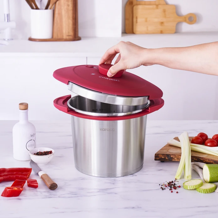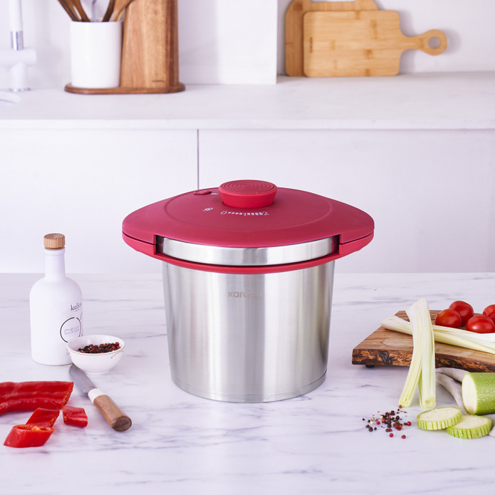 زودپز و بخارپز کاراجا ساخت کشور ترکیه میباشد .برند کاراجا از مشهورترین و باکیفیت ترین برندهای شناخته شده در سراسر جهان میباشد.و همانطور که میدانید امنیت کار با دستگاه زودپز مساله بسیار مهمی است که در تمام دنیا مصرفکنندگان به عنوان یک پارامتر مهم درنظر میگیرند، که با انتخاب این محصول استاندارد در رده ی جهانی میتوانید با خیال آسوده به آشپزی و پخت و پز در آشپزخانه بپردازید همچنین بر روی درب این محصول سوپاپ سه حالته فشار پخت تعبیه شده است .این محصول داری سیستم بازو بسته کردن درب ارگونومیکی میباشد که بازو بسته کردن درب را بسیار ساده و راحت انجام میشود.به صورتی طراحی و تولید شده که حرارت را بصورت مساوی به غذای در حال پخت انتقال میدهد.حجم این زودپز 6 لیتر میباشد جنس بیرون و داخل از استیل میباشد.