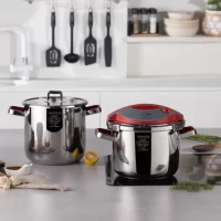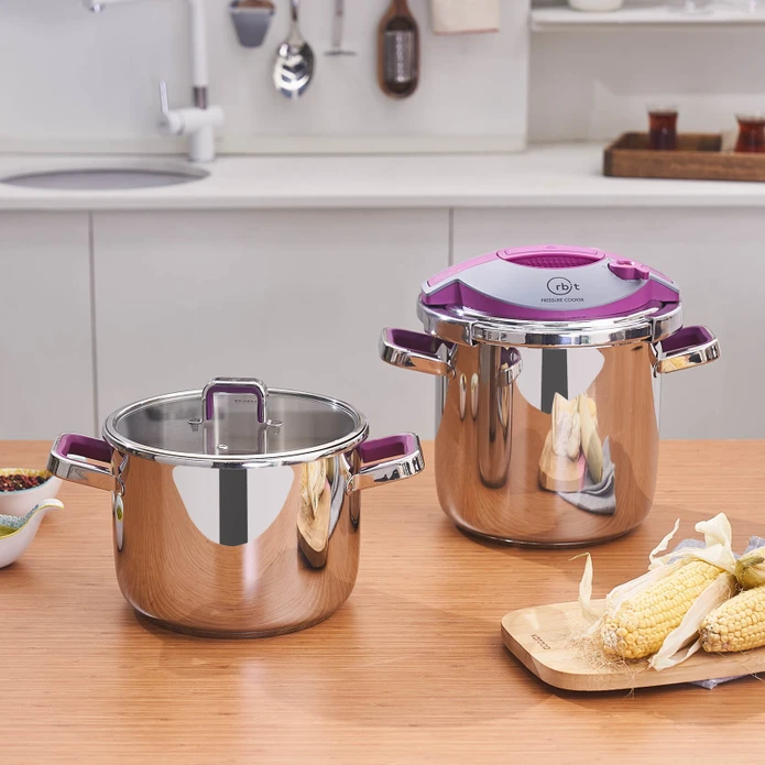 زودپز و بخارپز دوقلوی کاراجا ساخت کشور ترکیه میباشد .این ست دارای دو دیگ 8 و 6 لیتری می باشد . به همراه دستگاه یک درب قابلمه ای و یک درب زودپز عرضه شده است .دربهای فوق به هر دو دیگ 8 و 6 لیتری قابل اتصال است پس در اصل شما دو زودپز در اندازه های مختلف دارید و دو قابلمه در دو اندازه در واقع شما با خرید این محصول در واقع 4 محصول خریده اید 2 قابلمه و 2زودپز که این مورد یکی از ویژگیهای این مدل به حساب می آید.در صورت تمایل به پخت کمتر از دیگ کوچکتر و برای پخت بیشتر از دیگ بزرگتر می توان استفاده نمود.برند کاراجا از مشهورترین و باکیفیت ترین برندهای شناخته شده در سراسر جهان میباشد.و همانطور که میدانید امنیت کار با دستگاه زودپز مساله بسیار مهمی است که در تمام دنیا مصرفکنندگان به عنوان یک پارامتر مهم درنظر میگیرند، که با انتخاب این محصول استاندارد در رده ی جهانی میتوانید با خیال آسوده به آشپزی و پخت و پز در آشپزخانه بپردازید همچنین بر روی درب این محصول سوپاپ سه حالته فشار پخت تعبیه شده است .این محصول داری سیستم بازو بسته کردن درب ارگونومیکی میباشد که بازو بسته کردن درب را بسیار ساده و راحت انجام میشود.به صورتی طراحی و تولید شده که حرارت را بصورت مساوی به غذای در حال پخت انتقال میدهد.