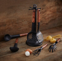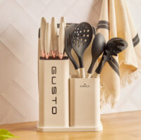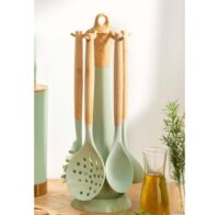 این ست 12 پارچه میباشد که شامل 5 عدد کارد 5 عدد کفگیر ملاقه 2 عدد استند و 1 عدد تخته گوشت میباشد