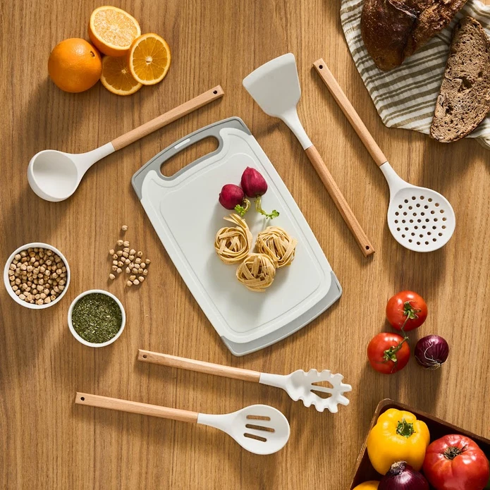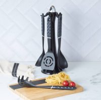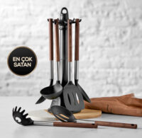 این ست 12 پارچه میباشد که شامل 5 عدد کارد 5 عدد کفگیر ملاقه 2 عدد استند و 1 عدد تخته گوشت میباشد