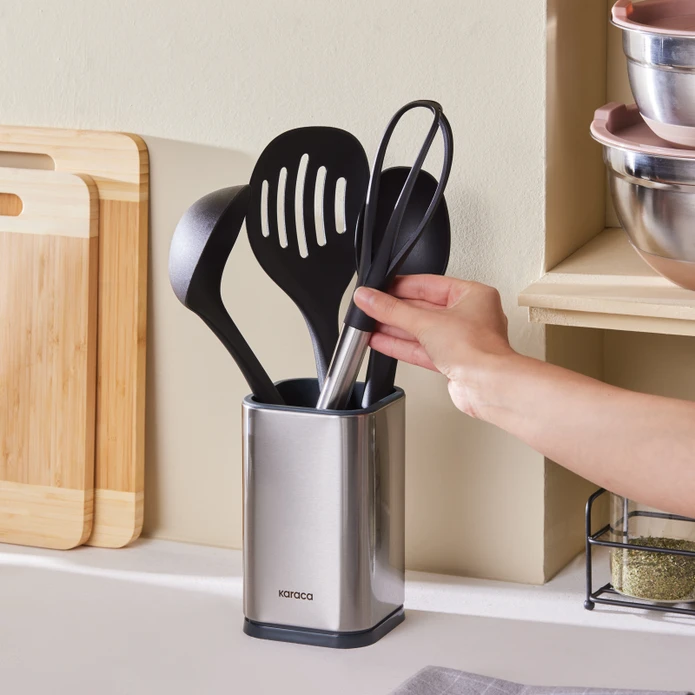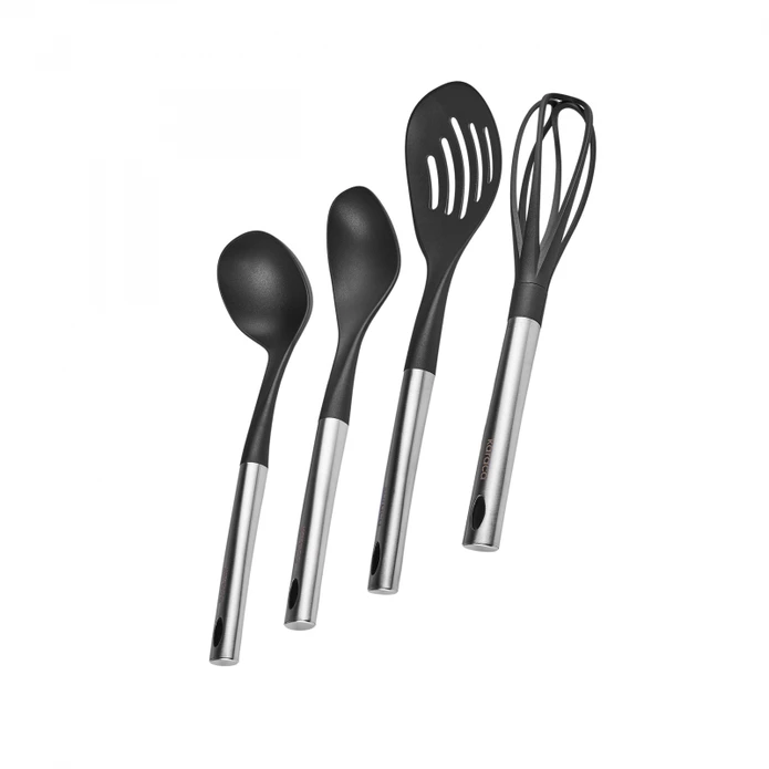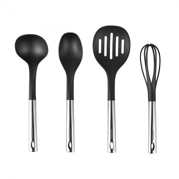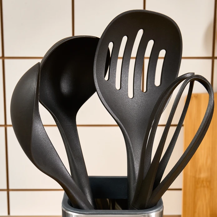 مواد ساخته شده سر کفگیر ملاقه ها پلاستیک فشرده با کیفیت فوق العاده عالی و مقاوم در برابر دما و جنس استند و دسته ها از استیل میباشد