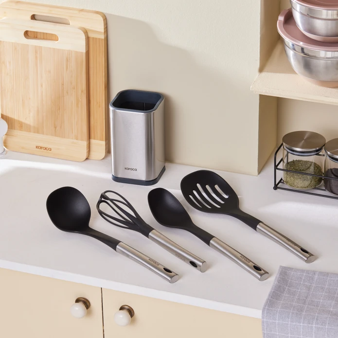 این ست شامل 4 عدد کفگیر و ملاقه + 1 عدد استند میباشد