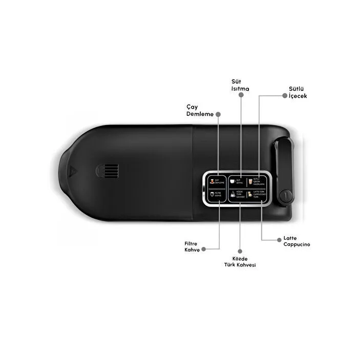 اما قسمت سمت چپ دستگاه کارایی متفاوتی دارد شما آب و قهوه یا شیر با قهوه رو به مخزن لیوانی شکل دستگاه اضافه میکنید و با توجه به نوشیدنی ای که میخواهید درست کنید دکمه مورد نظرتون رو انتخاب میکنید که پایینتر کامل توضیح داده میشود.حدودا 1 دقیقه بعد دستگاه با صدای هشدار آماده سازی شمارو از حاضر شدن قهوه یا نوشیدنی ای که با شیر میخواستید مطلع میکند و سنسور های دستگاه اتوماتیک دستگاه رو خاموش کرده و از سرریز شدن قهوه جلوگیری میکنند. البته باید همیشه به این مسئله دقت داشته باشید که روی مخزن لیوانی شکل دستگاه یک مینیموم و ماکسیموم درنظر گرفته شده که باید فقط تا اون محدوده شیر یا آب + قهوه اضافه کنید که این مینیموم و ماکسیموم برای تهیه قهوه ترک با آب و تهیه قهوه یا نوشیدنیهای دیگر با شیر متفاوت میباشد ( مینیموم شیر با süt minimum و ماکسیموم با süt maksimum ) نشان داده شده است. همچنین قابلیت تهیه کاپوچینو هات چاکلت و لته دارد. دستگیره مخصوص برای تهیه فوم و کف شیر دارد.