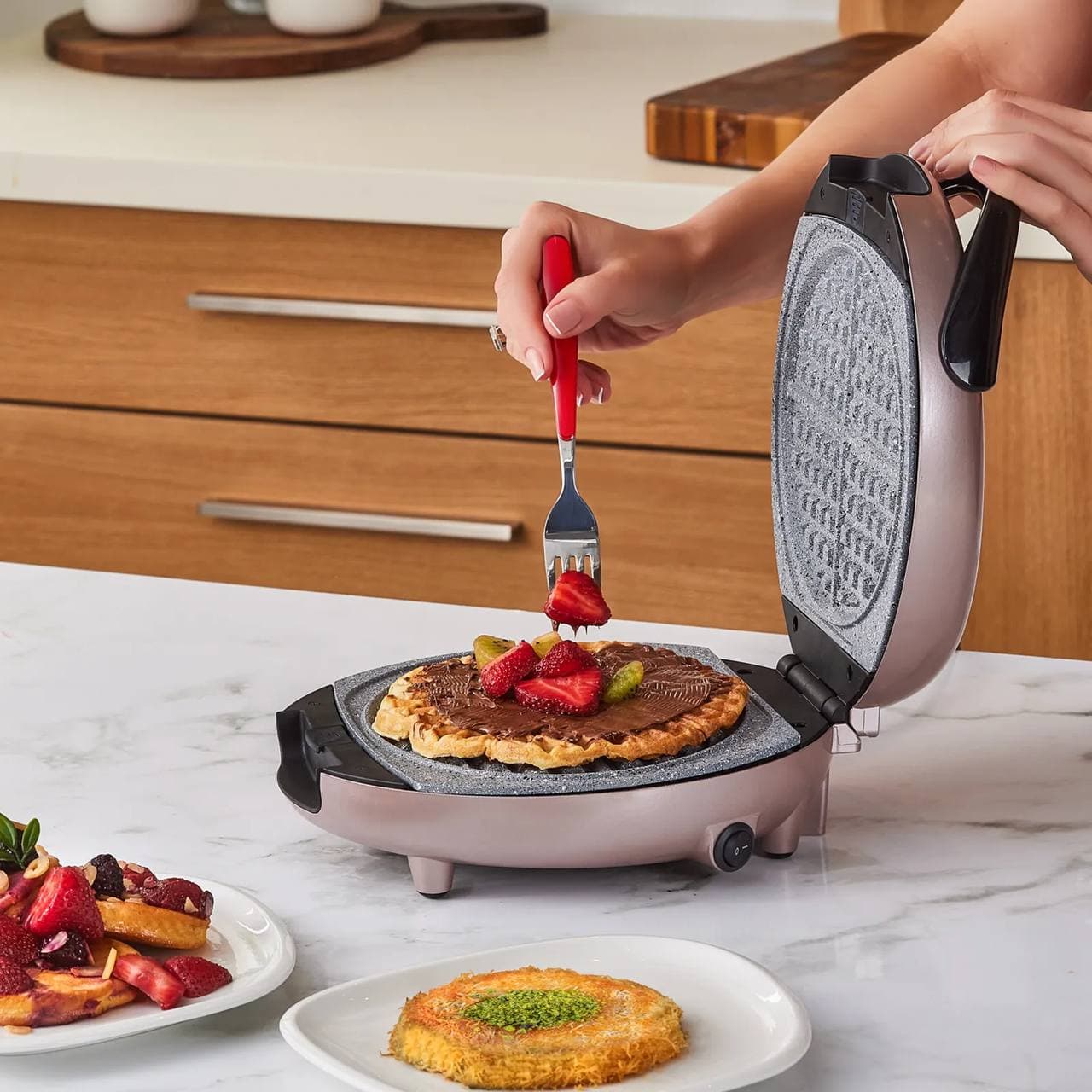 با صفحات روکش گرانیت مانند که گرما را به طور یکنواخت در همه جا پخش می کنند، وافل خام نمی ماند