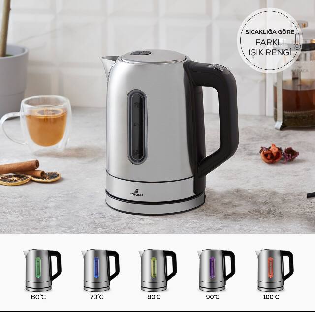 کتری برقی کاراجا مدل Led استیل حجم داخلی 1/7 لیتری با قدرت 2200 وات در کمترین زمان ممکن آب رو به دمای 100 درجه میرساند که در قسمت جلویی از چراغ آن قابل مشاهده میباشد.قابلیت چرخش 360 درجه بروی کفه کتری دارد. قابلیت قطع اتوماتیک و سیستم گرم نگهدارنده اتوماتیک هم دارد.جنس داخل و بیرونی از استیل میباشد.